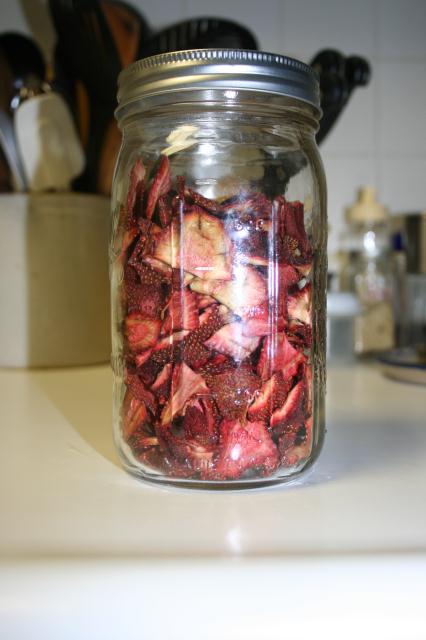 To dehydrate, I peel the kiwi and slice the same thickness and for the strawberries, I cut the tops off and cut in half.  I lay the fruit on the dehydrating tray, making sure that the fruit is not touching and there will be air flow around each piece.  I dehydrate at 135 degrees check after 6 hours – but both strawberries and kiwi can take anywhere from 7 – 15 hours to dehydrate.  I then store in a mason jar, I take the air out of with my food-saver (special attachment for jars) and store in a cool, dark cupboard.  These then come out during the winter months.