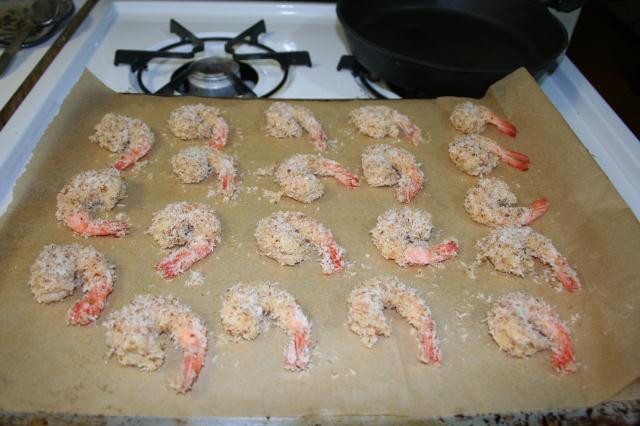 10. Dredge the shrimp through the flour mixture, tapping any excess flour off, then through the egg and lastly through the coconut/almond meal – tapping any excess off. Place on the parchment paper.