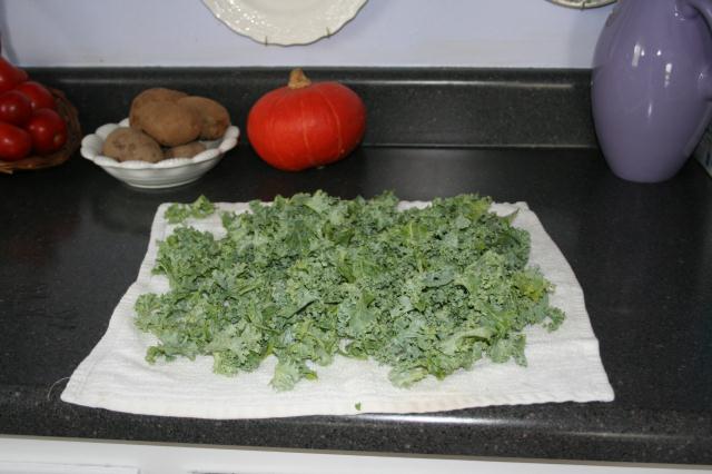 2. Carefully wash and spin dry the kale leaves. Curly kale takes some deliberate washing because gritty dirt can cling to the crevices of the leaves. Place the washed kale leaves on a towel, cover with another towel and pat dry – getting as much of the water off the leaves as possible.