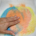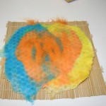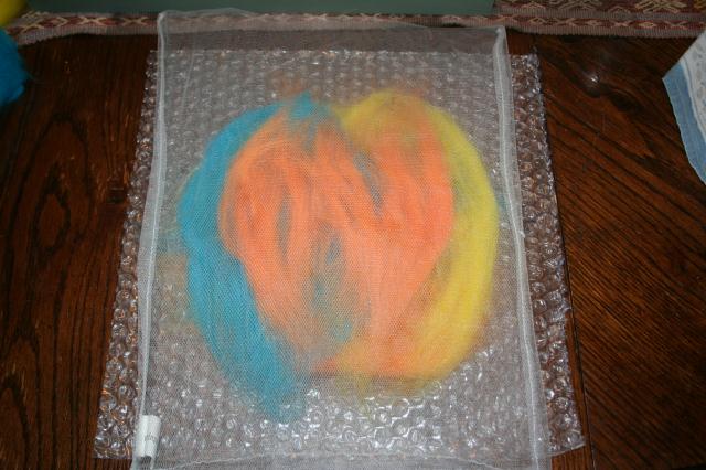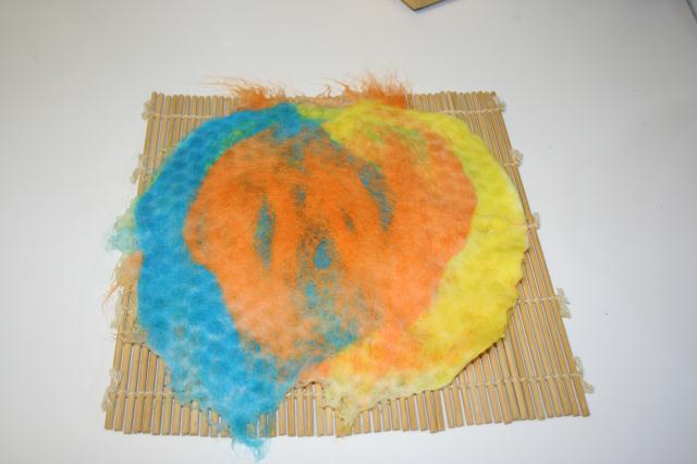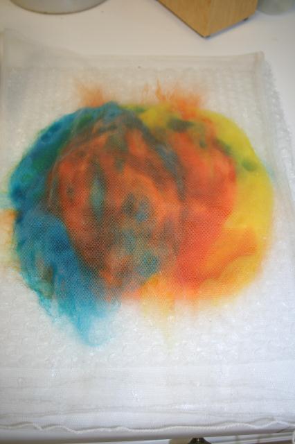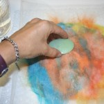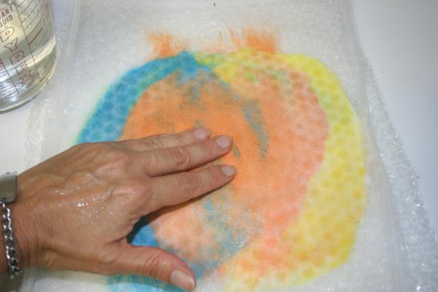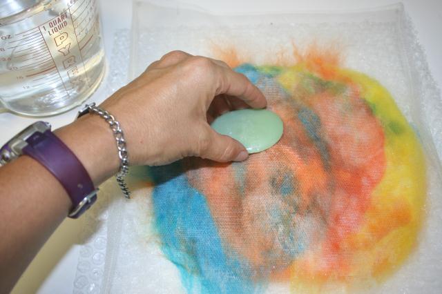 7. When it looks and feels like the wool has felted, carefully lift the mesh netting off the wool, releasing any trapped fibers.
