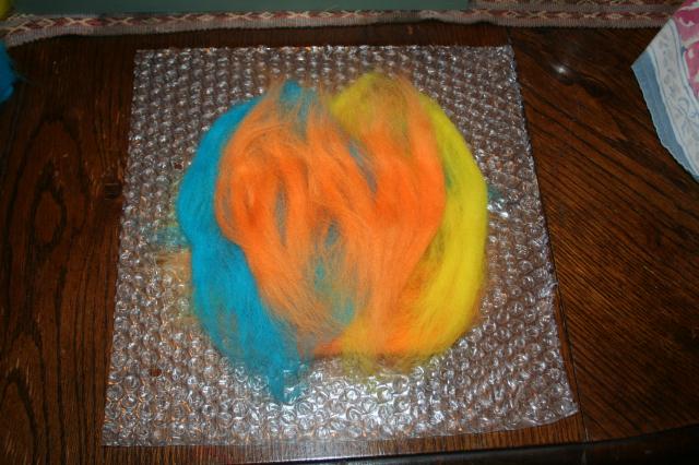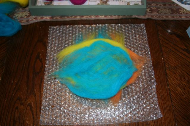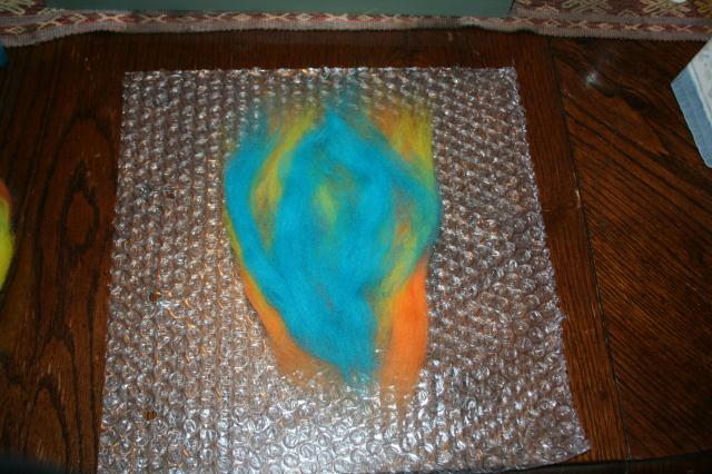 2. Lay your piece of bubble wrap on the table and layer your wool on it. First lay the tufts horizontally, then vertically and then horizontally again. This is done so that the fibers can interlock easier.