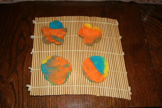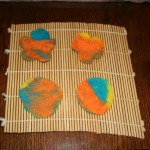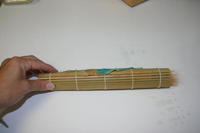 8. Gently pick up the felt piece off the bubble wrap and place on the sushi mat. Roll the piece up in the mat, tightly, draining any excess water.