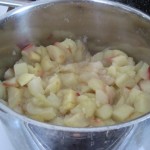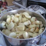 4. Put 1 inch of water into the large pot and add the cut apples until completely filled. If you do not want the apples to brown you can put the cut apples in a lemon juice wash prior to placing in the pot – I do not. Cover and turn the heat on high, once the water is boiling, turn the heat down to medium and keep the pot covered. Stir the apples occasionally – they are done when the apples are soft throughout. Turn the heat off and allow to cool, some.