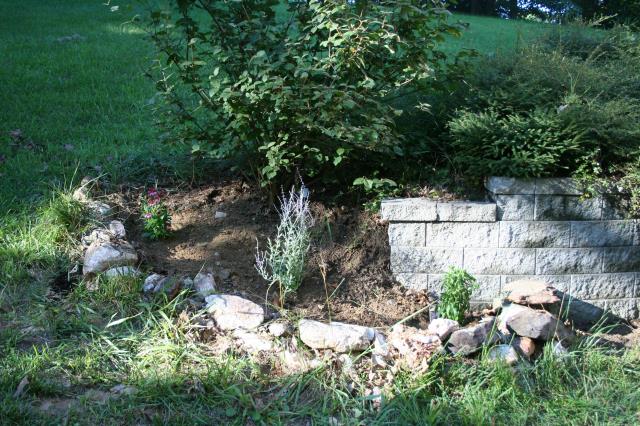 I have also started clearing other garden beds that are on the property. Several are overgrown with weeds and the plants that were original to the beds.  Another is turning into quite a project – removing all the rocks that were dumped in and then taking up the plastic lining that is about 1/2″ under the rocks and dirt – this is the bed that will eventually be the herb garden (next year!).  One of the side beds I was able to get cleared and plant some pollinator friendly plants.