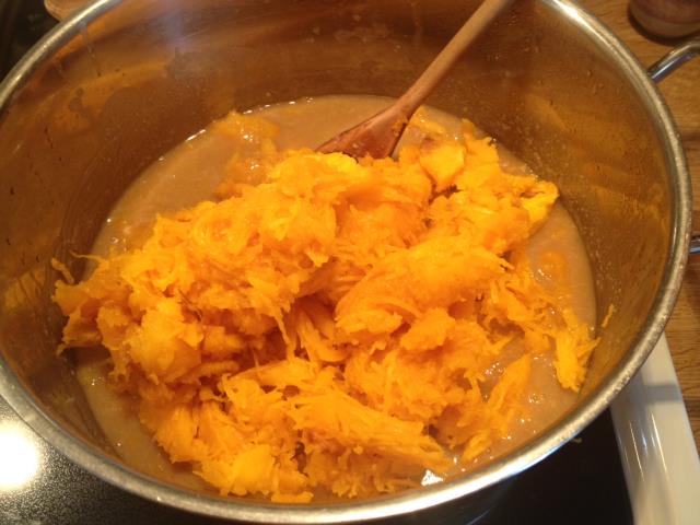6. Add the pumpkin “meat” to the broth and stir – add more broth. Let simmer for 5 – 10 minutes.