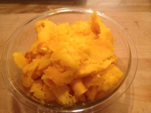 1. Roast your pumpkins.  When they are roasted, scoop the “meat” into a bowl, set aside.